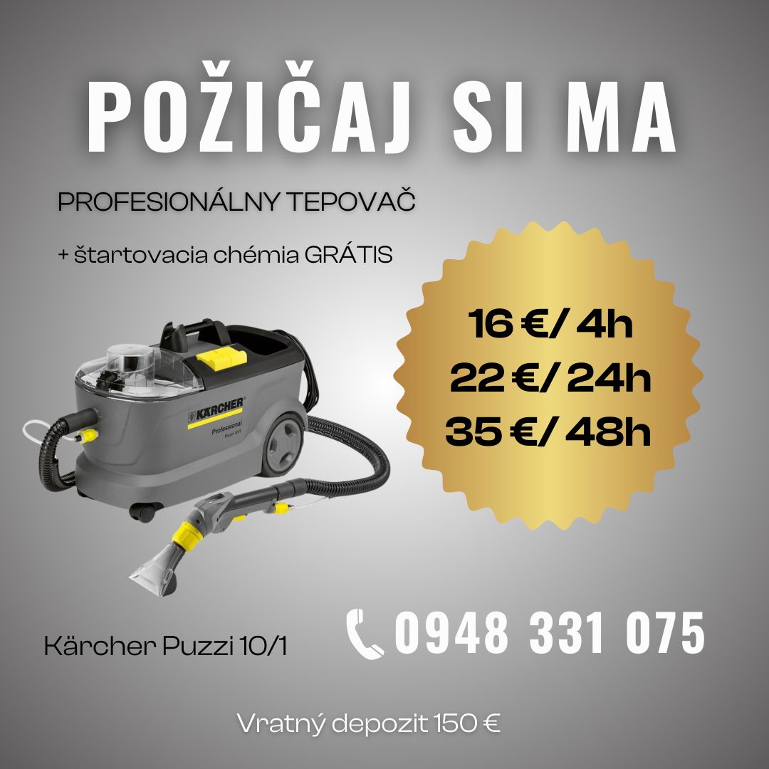 Zabezpečujeme prenájom profesionálnych tepovacích strojov značky Kärcher. Ponúkame lacné prenájmy tepovačov Kärcher puzzi 10/1. Naše stroje sú najvyššej kvality a so starostlivou údržbou, takže si môžete byť vždy istí, že Vám naše stroje poskytnú spoľahlivé služby.